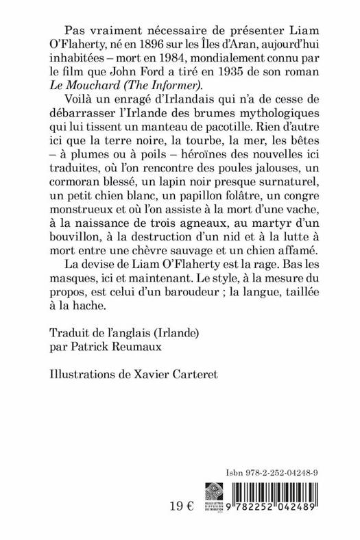 Pas vraiment necessaire de presenter Liam O'Flaherty, ne en 1896 sur les Iles d'Aran, aujourd'hui inhabitees - mort en 1984, mondialement connu par le film que John Ford a tire en 1935 de son roman Le Mouchard (The Informer).Voila un enrage d'Irlandais qui n'a de cesse de debarrasser l'Irlande des brumes mythologiques qui lui tissent un manteau de pacotille. Rien d'autre ici que la terre noire, la tourbe, la mer, les betes - a plumes ou a poils - heroines des nouvelles ici traduites, ou l'on rencontre des poules jalouses, un cormoran blesse, un lapin noir presque surnaturel, un petit chien blanc, un papillon folatre, un congre monstrueux et ou l'on assiste a la mort d'une vache, a la naissance de trois agneaux, au martyr d'un bouvillon, a la destruction d'un nid et a la lutte a mort entre une chevre sauvage et un chien affame. La devise de Liam O'Flaherty est la rage. Bas les masques, ici et maintenant. Le style, a la mesure du propos, est celui d'un baroudeur; la langue, taillee a la hache.