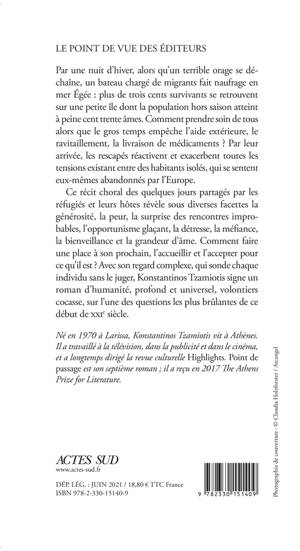 Par une nuit d'hiver, alors qu'un terrible orage se déchaîne, un bateau chargé de migrants fait naufrage dans la mer Égée : plus de trois cents survivants se retrouvent sur une petite île dont la population hors saison atteint à peine cent trente âmes. Comment prendre soin de tous alors que le gros temps empêche l'aide extérieure, le ravitaillement, la livraison de médicaments ? Par leur arrivée, les rescapés réactivent et exacerbent toutes les tensions existant entre des habitants isolés, qui se sentent eux-mêmes abandonnés par l'Europe. Ce récit choral des quelques jours partagés par les réfugiés et leurs hôtes révèle sous diverses facettes la générosité, la peur, la surprise des rencontres improbables, l'opportunisme glaçant, la détresse, la méfiance, la bienveillance et la grandeur d'âme. Comment faire une place à son prochain, l'accueillir et l'accepter pour ce qu'il est ? Avec son regard complexe, qui sonde chaque individu sans le juger, Konstantinos Tzamiotis signe un roman d'humanité, profond et universel, volontiers cocasse, sur l'une des questions les plus brûlantes de ce début de XXIe siècle.