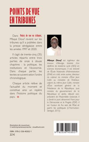 Dans Points de vue en tribunes, Mbaye Diouf revient sur les tribunes qu'il a publiées dans la presse sénégalaise entre les années 1997 et 2020. Il s'agit de trente-cinq (35) articles répartis entre trois parties de onze à douze chapitres: la politique, les institutions et l'économie. Dans chaque partie, les textes se suivent selon l'ordre chronologique. Chaque article relève de l'actualité du moment et constitue ainsi un repère dans l'histoire politique du pays.