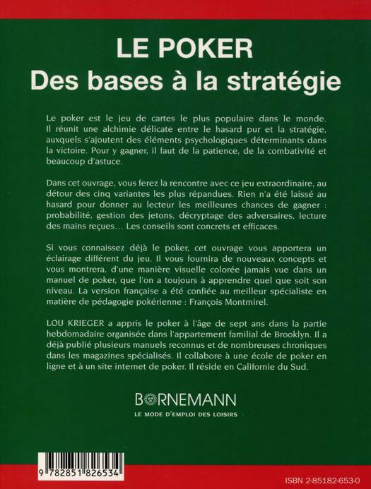 Le poker est le jeu de cartes le plus populaire dans le monde. Il réunit une alchimie délicate entre le hasard pur et la stratégie auxquels s'ajoutent des éléments psychologiques déterminants dans la victoire. Pour y gagner, il faut de la patience, de la combativité et beaucoup d'astuce. Dans cet ouvrage, vous ferez la rencontre avec ce jeu extraordinaire, au détour des cinq variantes les plus répandues. Rien n'a été laissé au hasard pour donner au lecteur les meilleures chances de gagner : probabilité, gestion des jetons, décryptage des adversaires, lecture des mains reçues... Les conseils sont concrets et efficaces. Si vous connaissez déjà le poker, cet ouvrage vous apportera un éclairage différent du jeu. Il vous fournira de nouveaux concepts et vous montrera, d'une manière visuelle colorée jamais vue dans un manuel de poker, que l'on a toujours à apprendre quel que soit son niveau. La version française a été confiée au meilleur spécialiste en matière de pédagogie pokérienne : François Montmirel.
