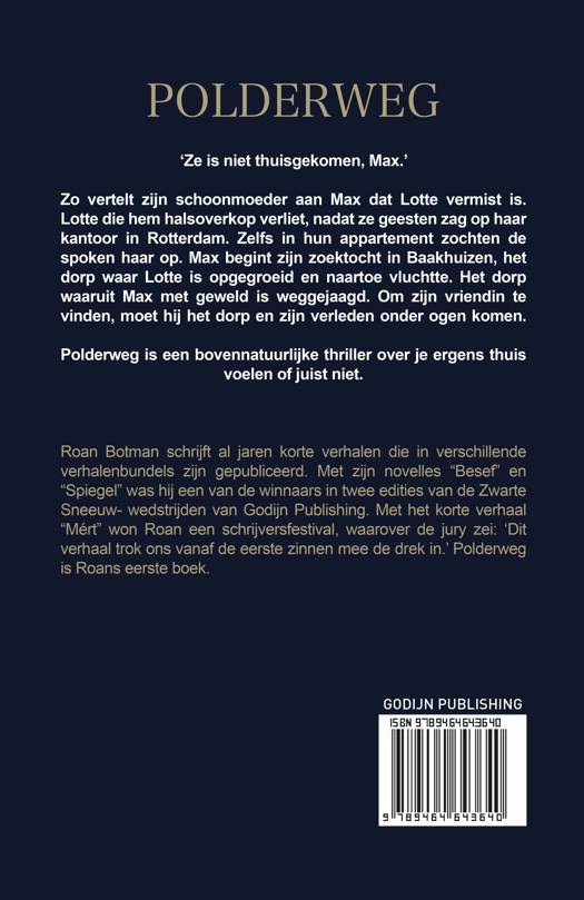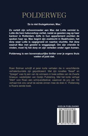 ‘Ze is niet thuisgekomen, Max.’ Zo vertelt zijn schoonmoeder aan Max dat Lotte vermist is. Lotte die hem halsoverkop verliet, nadat ze geesten zag op haar kantoor in Rotterdam. Zelfs in hun appartement zochten de spoken haar op. Max begint zijn zoektocht in Baakhuizen, het dorp waar Lotte is opgegroeid en naartoe vluchtte. Het dorp waaruit Max met geweld is weggejaagd. Om zijn vriendin te vinden, moet hij het dorp en zijn verleden onder ogen komen. Polderweg is een bovennatuurlijke thriller over je ergens thuis voelen of juist niet.