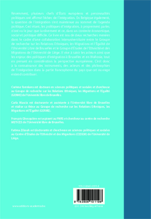 Ce livre est issu de deux recherches menées dans le cadre d'une collaboration interuniversitaire entre le Groupe de recherche sur les Relations Ethniques, les Migrations et l'Egalité de l'Université Libre de Bruxelles et le Groupe d'Etudes de l'Ethnicité et des Migrations de l'Université de Liège. Il vise à la connaissance des acteurs, instruments et philosophies de l'intégration dans la partie francophone du pays et de ses différents enjeux, en prenant en compte le débat européen.