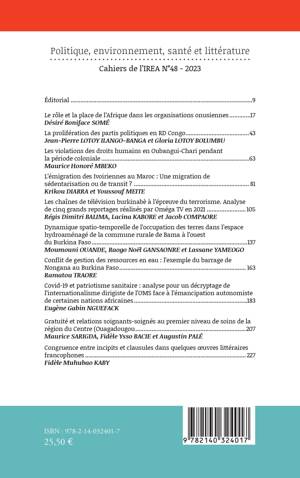 Éditorial.................................................................................................................9 Le rôle et la place de l'Afrique dans les organisations onusiennes..............17 Désiré Boniface SOMÉ La prolifération des partis politiques en RD Congo........................................43 Jean-Pierre LOTOY ILANGO-BANGA et Gloria LOTOY BOLUMBU Les violations des droits humains en Oubangui-Chari pendant la période coloniale............................................ 63 Maurice Honoré MBEKO L'émigration des Ivoiriennes au Maroc : Une migration de sédentarisation ou de transit ?........................................................................ 81 Krikou DIARRA et Youssouf MEITE Les chaînes de télévision burkinabè à l'épreuve du terrorisme. Analyse de cinq grands reportages réalisés par Oméga TV en 2021......................... 105 Régis Dimitri BALIMA, Lacina KABORE et Jacob COMPAORE Dynamique spatio-temporelle de l'occupation des terres dans l'espace hydroaménagé de la commune rurale de Bama à l'ouest du Burkina Faso.................................................................................................137 Moumouni OUANDE, Raogo Noël GANSAONRE et Lassane YAMEOGO Conflit de gestion des ressources en eau : l'exemple du barrage de Nongana au Burkina Faso............................................................................... 163 Ramatou TRAORE Covid-19 et patriotisme sanitaire : analyse pour un décryptage de l'internationalisme dirigiste de l'OMS face à l'émancipation autonomiste de certaines nations africaines.......................................................................183 Eugène Gabin NGUEFACK Gratuité et relations soignants-soignés au premier niveau de soins de la région du Centre (Ouagadougou.................................................207 Maurice SARIGDA, Fidèle Ysso BACIE et Augustin PALÉ Congruence entre incipits et clausules dans quelques œuvres littéraires francophones............................................................... 227 Fidèle Muhubao KABY