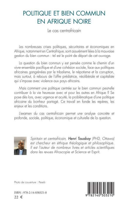 Les nombreuses crises politiques, sécuritaires et économiques en Afrique, notamment en Centrafrique, sont assurément liées à la mauvaise gestion du bien commun: tel est le point de départ de cet ouvrage. La question du bien commun y est pensée comme le chemin d'un vivre ensemble pacifique et d'une cohésion sociale, face aux politiques africaines gangrénées par le tribalisme, le népotisme et la corruption, mais surtout, à rebours de l'offre prédatrice, néolibérale et capitaliste qui s'impose avec violence aux pays africains. Mais comment une politique centrée sur le bien commun peut-elle contribuer à la vie heureuse avec et pour les autres en Afrique ? Se pose dès lors, avec urgence et acuité, la problématique d'une politique africaine du bonheur partagé. Ce travail en fonde les repères, les enjeux et les conditions. L'examen du cas centrafricain permet une analyse concrète et profonde, sociale, politique, économique et culturelle de la question.
