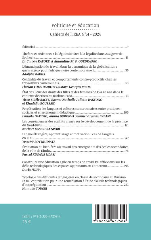 Théâtre et résistance: la légitimité face à la légalité dans Antigone de Sophocle de Dr Calixte KABORE et Amandine M. F. OUEDRAOGO L'émancipation du travail dans la dynamique de la globalisation: quels enjeux pour l'Afrique noire contemporaine ? de Adolphe BADIEL Centralité du travail et comportements contre-productifs chez les travailleurs camerounais de Florian FOKA DADIE et Gustave Georges MBOE État des lieux des droits des filles et des femmes de 15 à 40 ans dans le contexte de crises au Burkina Faso de Yisso Fidèle BACYE, Ezoma Nathalie Juliette BAKYONO et Khadidja BOUSSAÏD Perpétuation des langues et cultures camerounaises entre pratiques sociales et enseignement didactique de Ismaïla DATIDJO, Amina GORON et Jeanne Virginia EKEANI Les conséquences des conflits armés sur le développement de la province du Nord-Kivu de Norbert KASEREKA SIVIRI Langue étrangère, apprentissage et motivation: cas de l'anglais en RDC de Yves MABOY MUDIATA Évaluation du bien-être au travail des enseignants des écoles secondaires de la ville de Kindu de Pascal KUGANA NDASI Construire une éducation agile en temps de Covid-19: réflexions sur les défis technologiques des espaces apprenants au Cameroun de Durix NJIHA Typologie des difficultés langagières en classe de secondaire au Burkina Faso: contribution pour une remédiation à l'aide d'outils technologiques d'autorégulation de Hamado TOUGRI