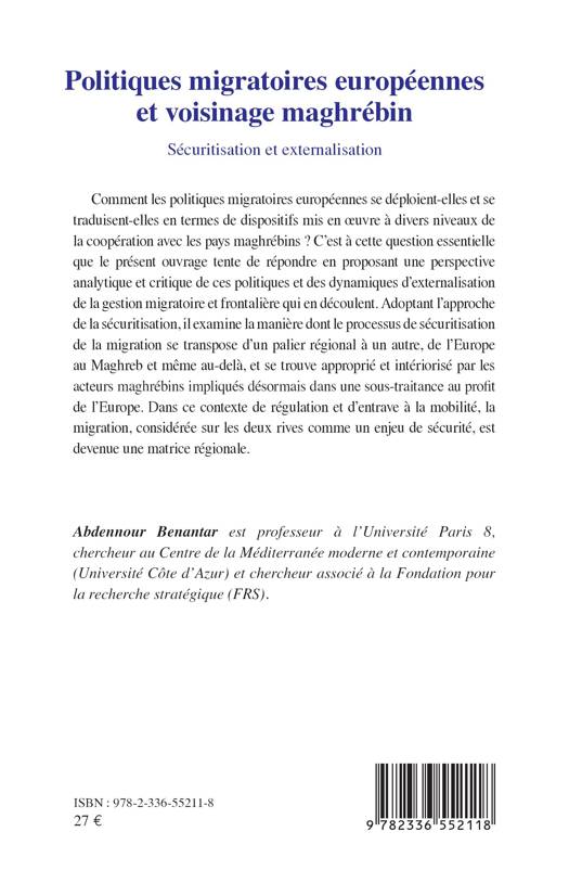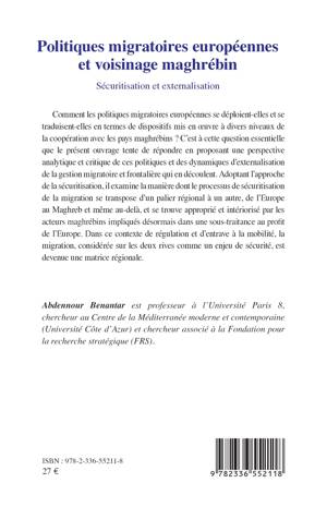 Comment les politiques migratoires européennes se déploient-elles et se traduisent-elles en termes de dispositifs mis en oeuvre à divers niveaux de la coopération avec les pays maghrébins ? C'est à cette question essentielle que le présent ouvrage tente de répondre en proposant une perspective analytique et critique de ces politiques et des dynamiques d'externalisation de la gestion migratoire et frontalière qui en découlent. Adoptant l'approche de la sécuritisation, il examine la manière dont le processus de sécuritisation de la migration se transpose d'un palier régional à un autre, de l'Europe au Maghreb et même au-delà, et se trouve approprié et intériorisé par les acteurs maghrébins impliqués désormais dans une sous-traitance au profit de l'Europe. Dans ce contexte de régulation et d'entrave à la mobilité, la migration, considérée sur les deux rives comme un enjeu de sécurité, est devenue une matrice régionale.