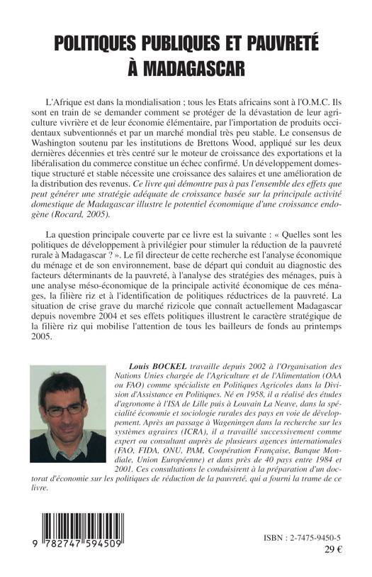 La question principale de cet ouvrage est la suivante: "Quelles sont les politiques de développement à privilégier pour stimuler la réduction de la pauvreté rurale à Madagascar ?" Le fil directeur de cette recherche est l'analyse économique du ménage et de son environnement, qui conduit au diagnostic des facteurs déterminants de la pauvreté, à l'analyse des stratégies des ménages, puis une analyse méso-économique de la principale activité de ces ménages, la filière riz qui est actuellement en situation de crise grave.
