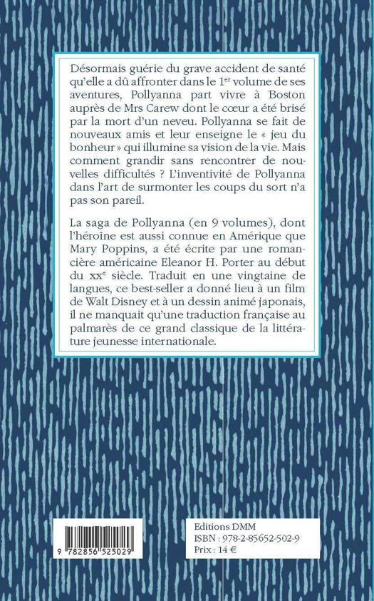 Désormais guérie du grave accident de santé qu'elle a dû affronter dans le 1er volume de ses aventures, Pollyanna part vivre à Boston auprès de Mrs Carew dont le cÅur a été brisé par la mort d'un neveu. Pollyanna se fait de nouveaux amis et leur enseigne le « jeu du bonheur » qui illumine sa vision de la vie. Mais comment grandir sans rencontrer de nouvelles difficultés ? L'inventivité de Pollyanna dans l'art de surmonter les coups du sort n'a pas son pareil. La saga de Pollyanna (en 9 volumes), dont l'héroïne est aussi connue en Amérique que Mary Poppins, a été écrite par une romancière américaine Eleanor H. Porter au début du xxe siècle. Traduit en une vingtaine de langues, ce best-seller a donné lieu à un film de Walt Disney et à un dessin animé japonais, il ne manquait qu'une traduction française au palmarès de ce grand classique de la littérature jeunesse internationale.