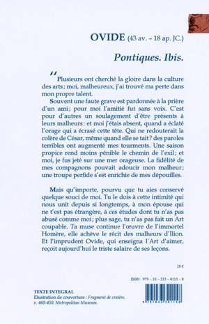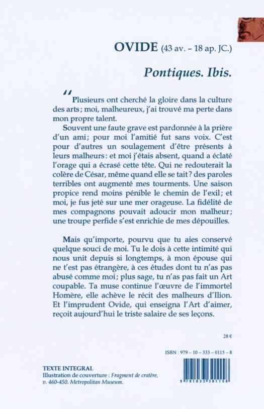 Mais qu'importe, pourvu que tu aies conservé quelque souci de moi. Tu le dois à cette intimité qui nous unit depuis si longtemps, à mon épouse qui ne t'est pas étrangère, à ces études dont tu n'as pas abusé comme moi ; plus sage, tu n'as pas fait un Art coupable. Ta muse continue l'oeuvre de l'immortel Homère, elle achève le récit des malheurs d'Ilion. Et l'imprudent Ovide, qui enseigna l'Art d'aimer, reçoit aujourd'hui le triste salaire de ses leçons.