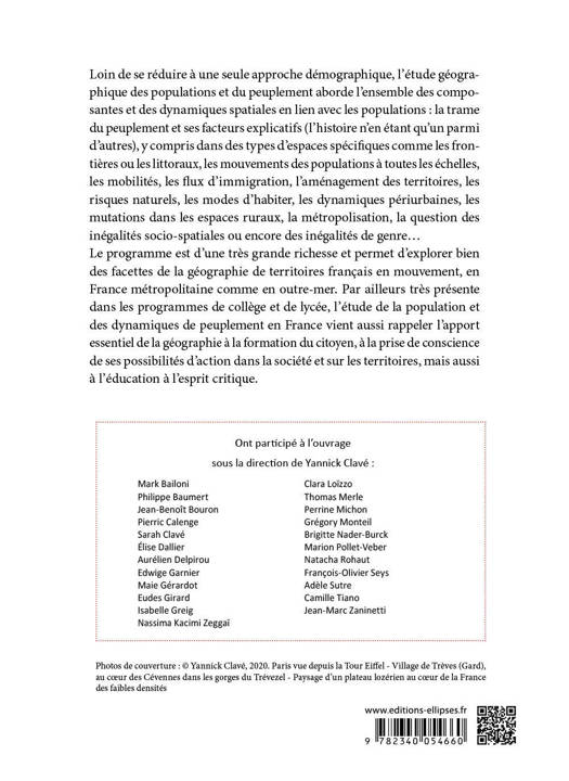 Le programme est d’une très grande richesse et permet d’explorer bien des facettes de la géographie de territoires français en mouvement, en France comme en outre-mer. Par ailleurs très présente dans les programmes de collège et de lycée, l’étude de la population et des dynamiques de peuplement en France vient aussi rappeler l’apport essentiel de la géographie à la formation du citoyen, à la prise de conscience de ses possibilités d’action dans la société et sur les territoires, mais aussi à l’éducation à l’esprit critique.