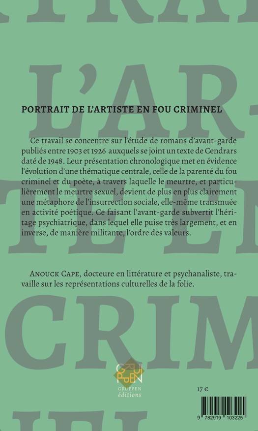 Ce travail se concentre sur l'étude de romans d'avant-garde publiés entre 1903 et 1926 auxquels se joint un texte de Cendrars daté de 1948 . Leur présentation chronologique met en évidence l'évolution d'une thématique centrale, celle de la parenté du fou criminel et du poète, à travers laquelle le meurtre, et particulièrement le meurtre sexuel, devient de plus en plus clairement une métaphore de l'insurrection sociale, elle-même transmuée en activité poétique. Ce faisant l'avant-garde subvertit l'héritage psychiatrique, dans lequel elle puise très largement, et en inverse, de manière militante, l'ordre des valeurs. Pour mieux comprendre tout le sens de ce renversement, il convient de rappeler les conflits qui opposèrent, à la fin du XIXe siècle, littérature et médecine mentale au moment où la théorie de la dégénérescence a envahi le champ de l'aliénisme.
