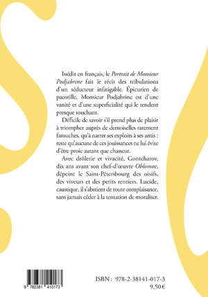 Inédit en français, le Portrait de Monsieur Podjabrine fait le récit des tribulations d’un séducteur infatigable. Épicurien de pacotille, Monsieur Podjabrine est d’une vanité et d’une superficialité qui le rendent presque touchant.