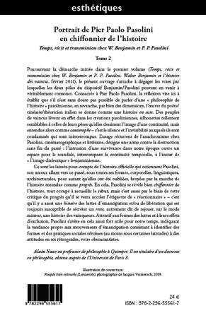 Poursuivant la démarche initiée dans le premier volume (Temps, récit et transmission chez W. Benjamin et P. P. Pasolini), le présent ouvrage s'attache à dégager les voies par lesquelles les deux pôles du dispositif Benjamin/Pasolini peuvent en venir à véritablement consoner. Consacrée à Pier Paolo Pasolini, la réflexion vise ici à établir que s'il n'est sans doute pas possible de parler d'une " philosophie de l'histoire " pasolinienne, en revanche, par bien des dimensions, l'œuvre du poète/cinéaste/théoricien italien se donne comme une histoire en acte.