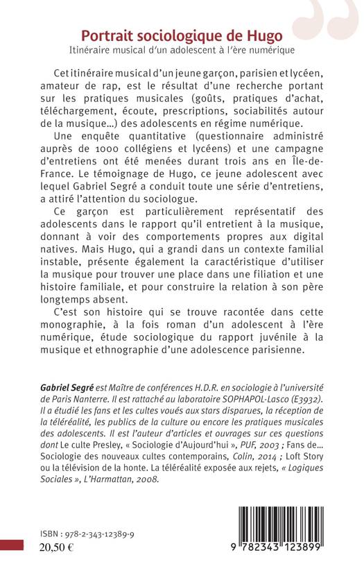 Hugo est particulièrement représentatif des adolescents dans son rapport à la musique, donnant à voir des comportements propres aux digital natives. Mais ce garçon, qui a grandi dans un contexte familial instable, présente également la caractéristique d'utiliser la musique pour se trouver une place dans une filiation. Cet itinéraire musical est également le résultat d'une enquête quantitative et d'une campagne d'entretiens menés durant trois ans en Île-de-France, donnant à cet ouvrage une dimension sociologique et ethnographique.