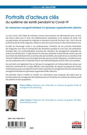 La crise Covid a fait l’objet de nombreux travaux documentant son déroulement pour en tirer des leçons utiles pour le futur des établissements hospitaliers et du système de santé. Cet ouvrage adopte une perspective originale en dressant le portrait d’acteurs clés, c’est-à-dire de professionnels de santé, soignants, médecins, directeurs qui ont joué un rôle central dans la crise. Au-delà de l’hommage rendu à ces professionnels, l’ambition de ces portraits thématisés est d’apporter une mise en perspective des évolutions pendant la crise avec une profondeur d’analyse liée à la contextualisation humaine des situations de management auxquelles les acteurs ont dû faire face. Il s’agit de lever le voile pour présenter la diversité des acteurs qui ont oeuvré dans les établissements, la richesse des personnalités, des expériences accumulées et de montrer la détermination qui s’est forgée dans des parcours parfois atypiques, constituant aussi une des explications de la créativité et de la réactivité développées durant cette crise sanitaire. Ces portraits sont également dus au fait que le management est indissociable des acteurs qui l’exercent. Autrement dit, il s’avère difficile, voire impossible, de séparer la pratique de l’acteur, d’autant plus que par son objectif visant l’action organisée, le management articule volontarisme managérial individuel et dynamique organisationnelle collective. Ces portraits visent à mettre en lumière ces mécanismes pour proposer des pistes pour la transformation du management des établissements et l’évolution du système de santé au profit des patients et de la population.