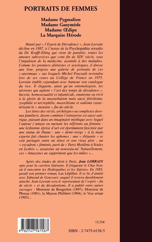 Hanté par "l'esprit de décadence", Jean Lorrain décline en1887, toutes les amours subversives que cette fin de XIX siècle, sous l'impulsion de la médecine, assimile à des maladies. Il dresse ainsi une galerie de portraits de ces "anormaux" sur lesquels Michel Foucault reviendra lors de ses cours au Collège de France en 1975. L 'auteur s'amuse en mettant les référents au féminin comme La Marquise Hérode, Madame Oedipe, Madame Ganymède, Madame Pygmalion, ces "Amazones qui ne suppriment que les mâles".