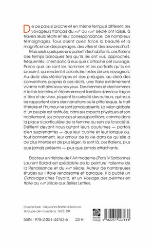 De ce pays si proche et en meme temps si different, les voyageurs francais du XVIe au XVIIIe siecle ont laisse, a travers leurs recits et leur correspondance, de nombreux temoignages. Tous disent avec force la beaute et la magnificence des paysages, des villes et des oeuvres d'art. Mais seuls quelques-uns parlent des habitants, ces Italiens des temps baroques tels qu'ils les ont vus, approches, frequentes; c'est donc a eux que s'attache cet ouvrage. Parce que ce sont les hommes et les portraits qu'ils en brossent, qui rendent si colores les textes de ces voyageurs. Au-dela des stereotypes et des prejuges, au-dela des conventions propres a ces recits, une Italie extremement vivante nait ainsi sous nos yeux. Des femmes et des hommes a la fois lointains et etonnamment familiers dans leur facon d'etre et de vivre, piquent la curiosite des auteurs, qui nous les rapportent dans des narrations ou le pittoresque, le trait litteraire et l'humour ne sont jamais absents. La vision globale d'un peuple est restituee, dans ses aspects physiques et son habillement, ses croyances et ses superstitions, comme dans la place si particuliere de la femme au sein de la societe. Defilent devant nous autant leurs coutumes - parfois bien surprenantes - que leur cuisine et leur langue ou, tout bonnement, leur amour de la vie dans ce qu'elle a de plus intense et de plus leger. Ils sont la, ces Italiens, plus que jamais presents - plus que jamais attachants.