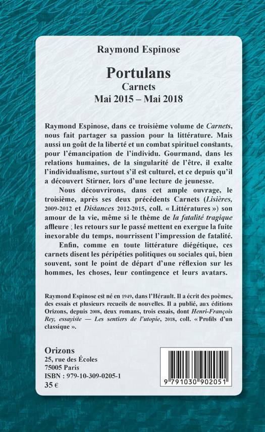 Raymond Espinose, dans ce troisième volume de Carnets, nous fait partager sa passion pour la littérature. Nous découvrirons, dans cet ample ouvrage, le troisième, après ses deux précédents Carnets (Lisières, 2009-2012 et Distances 2012-2015, coll. « Littératures » son amour de la vie, même si le thème de la fatalité tragique affleure. Enfin, ces carnets disent les péripéties politiques ou sociales qui, bien souvent, sont le point de départ d'une réflexion sur les hommes, les choses, leur contingence et leurs avatars.