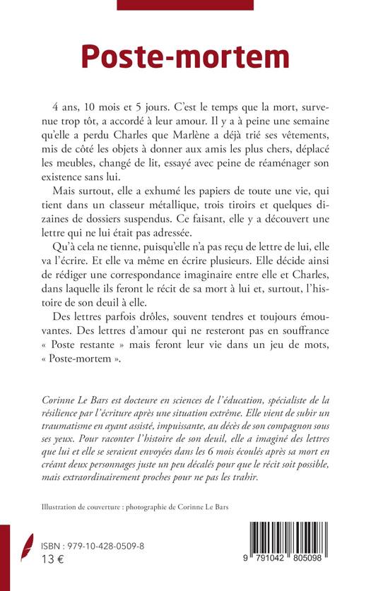 4 ans, 10 mois et 5 jours. C’est le temps que la mort, survenue trop tôt, a accordé à leur amour. Il y a à peine une semaine qu’elle a perdu Charles que Marlène a déjà trié ses vêtements, mis de côté les objets à donner aux amis les plus chers, déplacé les meubles, changé de lit, essayé avec peine de réaménager son existence sans lui. Mais surtout, elle a exhumé les papiers de toute une vie, qui tient dans un classeur métallique, trois tiroirs et quelques dizaines de dossiers suspendus. Ce faisant, elle y a découvert une lettre qui ne lui était pas adressée. Qu’à cela ne tienne, puisqu’elle n’a pas reçu de lettre de lui, elle va l’écrire. Et elle va même en écrire plusieurs. Elle décide ainsi de rédiger une correspondance imaginaire entre elle et Charles, dans laquelle ils feront le récit de sa mort à lui et, surtout, l’histoire de son deuil à elle. Des lettres parfois drôles, souvent tendres et toujours émouvantes. Des lettres d’amour qui ne resteront pas en souffrance « Poste restante » mais feront leur vie dans un jeu de mots, « Poste-mortem ».