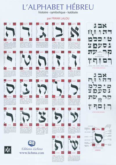 Ce poster présente synthétiquement chacune des 22 lettres de l'alphabet hébreu avec la lettre latine correspondante, la valeur numérique, la symbolique, le dessin de la lettre, le nom de la lettre et sa traduction. Les lettres sacrées ashkénazes et séfarades sont également représentées.