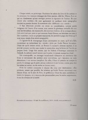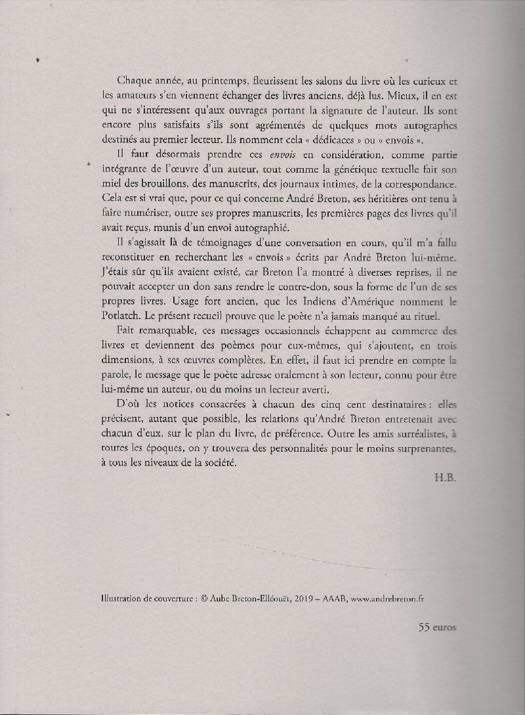 Chaque année, au printemps, fleurissent les salons du livre où les curieux et les amateurs s’en viennent échanger des livres anciens, déjà lus. Mieux, il en est qui ne s’intéressent qu’aux ouvrages portant la signature de l’auteur. Ils sont encore plus satisfaits s’ils sont agrémentés de quelques mots autographes destinés au premier lecteur. Ils nomment cela « dédicaces » ou « envois ». Il faut désormais prendre ces envois en considération, comme partie intégrante de l’œuvre d’un auteur, tout comme la génétique textuelle fait son miel des brouillons, des manuscrits, des journaux intimes, de la correspondance. Cela est si vrai que, pour ce qui concerne André Breton, ses héritières ont tenu à faire numériser, outre ses propres manuscrits, les premières pages des livres qu’il avait reçus, munis d’un envoi autographié. Il s’agissait là de témoignages d’une conversation en cours, qu’il m’a fallu reconstituer en recherchant les « envois » écrits par André Breton lui-même. J’étais sûr qu’ils avaient existé, car Breton l’a montré à diverses reprises, il ne pouvait accepter un don sans rendre le contre-don, sous la forme de l’un de ses propres livres. Usage fort ancien, que les Indiens d’Amérique nomment le Potlatch. Le présent recueil prouve que le poète n’a jamais manqué au rituel. Fait remarquable, ces messages occasionnels échappent au commerce des livres et deviennent des poèmes pour eux-mêmes, qui s’ajoutent, en trois dimensions, à ses œuvres complètes. En effet, il faut ici prendre en compte la parole, le message que le poète adresse oralement à son lecteur, connu pour être lui-même un auteur, ou du moins un lecteur averti. D’où les notices consacrées à chacun des cinq cent destinataires : elles précisent, autant que possible, les relations qu’André Breton entretenait avec chacun d’eux, sur le plan du livre, de préférence. Outre les amis surréalistes, à toutes les époques, on y trouvera des personnalités pour le moins surprenantes, à tous les niveaux de la société. H.B.