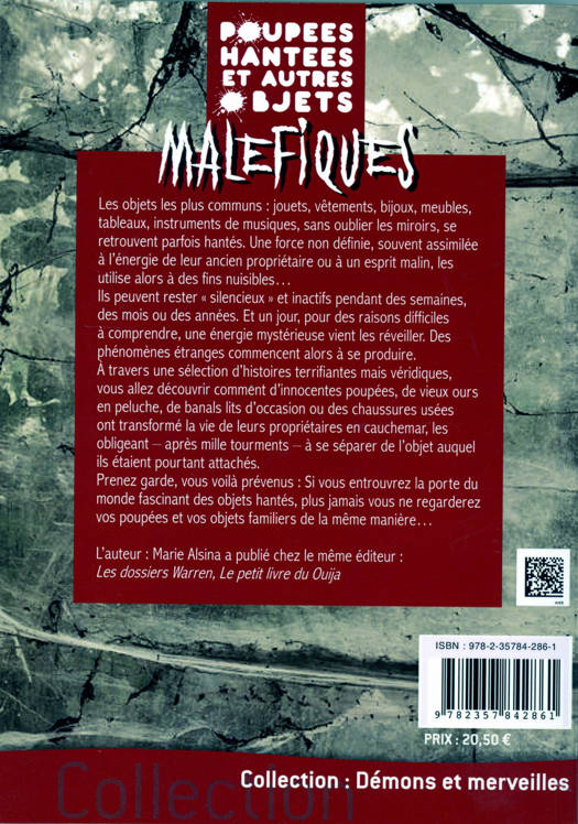 Les objets les plus communs : jouets, vêtements, bijoux, meubles, tableaux, instruments de musiques, sans oublier les miroirs, se retrouvent parfois hantés. Une force non définie, souvent assimilée à l'énergie de leur ancien propriétaire ou à un esprit malin, les utilise alors à des fins nuisibles… Ils peuvent rester « silencieux » et inactifs pendant des semaines, des mois ou des années. Et un jour, pour des raisons difficiles à comprendre, une énergie mystérieuse vient les réveiller. Des phénomènes étranges commencent alors à se produire. À travers une sélection d’histoires terrifiantes mais véridiques, vous allez découvrir comment d’innocentes poupées, de vieux ours en peluche, de banals lits d’occasion ou des chaussures usées ont transformé la vie de leurs propriétaires en cauchemar, les obligeant - après mille tourments - à se séparer de l'objet auquel ils étaient pourtant attachés. Cependant, prenez garde ! Si vous entrouvrez la porte du monde fascinant des objets hantés, plus jamais vous ne regarderez vos poupées et vos objets familiers de la même manière…