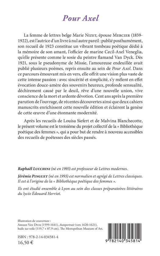 La femme de lettres belge Marie Nizet, épouse Mercier (1859-1922), est l'autrice d'un livre à nul autre pareil: publié posthumément, son recueil de 1923 constitue un vibrant tombeau poétique dédié à la mémoire de son amant, l'officier de marine Cecil-Axel Veneglia, qu'elle présente comme le sosie du peintre flamand Van Dyck. Dès 1921, sous le pseudonyme de Missie, l'amoureuse endeuillée avait publié plusieurs poèmes, repris ensuite au sein de Pour Axel. Dans ce parcours émouvant mis en vers, elle offrit une vision plus vaste de cette intense passion: avec sincérité et simplicité, s'y mêlent en effet évocation douce-amère des souvenirs heureux, profonde sensualité, déchirement causé par le deuil, rêve d'une nouvelle union, vive conscience de la mort et ardente dévotion. Cent ans après la première parution de l'ouvrage, de récentes découvertes ainsi que deux cahiers manuscrits enrichissent cette nouvelle édition et éclairent la genèse de cette oeuvre d'une étonnante modernité. Après les recueils de Louisa Siefert et de Malvina Blanchecotte, le présent volume est le troisième du projet collectif de la Bibliothèque poétique des femmes, qui a pour but de rendre à nouveau accessibles des recueils de poétesses des siècles passés.