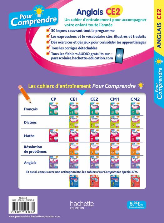 30 leçons couvrant tout le programme d’anglais du CE2 en : Expression orale – Compréhension – Vocabulaire.
