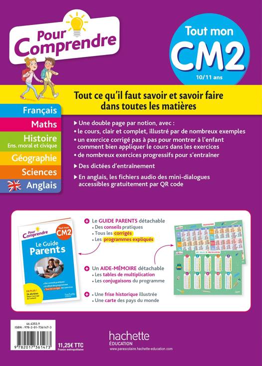 EN PLUS ! En fin d’ouvrage : une frise historique et un planisphère + un aide-mémoire pour connaître les tables de multiplication et toutes les conjugaisons au programme