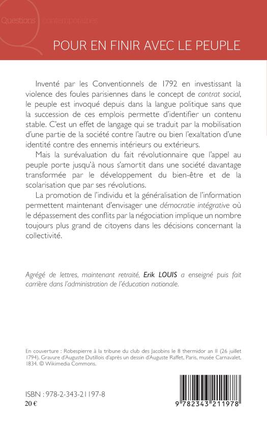 Inventé par les Conventionnels de 1792 en investissant la violence des foules parisiennes dans le concept de contrat social, le peuple est invoqué depuis dans la langue politique sans qu'on en puisse identifier un contenu stable. C'est un effet de langage qui se traduit par la mobilisation d'une partie de la société contre l'autre ou bien l'exaltation d'une identité contre des ennemis intérieurs ou extérieurs. Mais la surévaluation du fait révolutionnaire, que l'appel au peuple porte, s'amortit dans une société davantage transformée par le développement du bien-être et de la scolarisation. La promotion de l'individu et la généralisation de l'information permettent maintenant d'envisager une démocratie intégrative où le dépassement des conflits par la négociation implique un nombre toujours plus grand de citoyens dans les décisions concernant la collectivité.