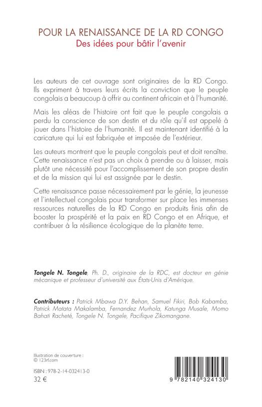 Les auteurs de cet ouvrage sont originaires de la RD Congo. Ils expriment à travers leurs écrits la conviction que le peuple congolais a beaucoup à offrir au continent africain et à l'humanité. Mais les aléas de l'histoire ont fait que le peuple congolais a perdu la conscience de son destin et du rôle qu'il est appelé à jouer dans l'histoire de l'humanité. Il est maintenant identifié à la caricature qui lui est fabriquée et imposée de l'extérieur. Les auteurs montrent que le peuple congolais peut et doit renaître. Cette renaissance n'est pas un choix à prendre ou à laisser, mais plutôt une nécessité pour l'accomplissement de son propre destin et de la mission qui lui est assignée par le destin. Cette renaissance passe nécessairement par le génie, la jeunesse et l'intellectuel congolais pour transformer sur place les immenses ressources naturelles de la RD Congo en produits finis afin de booster la prospérité et la paix en RD Congo et en Afrique, et contribuer à la résilience écologique de la planète terre.