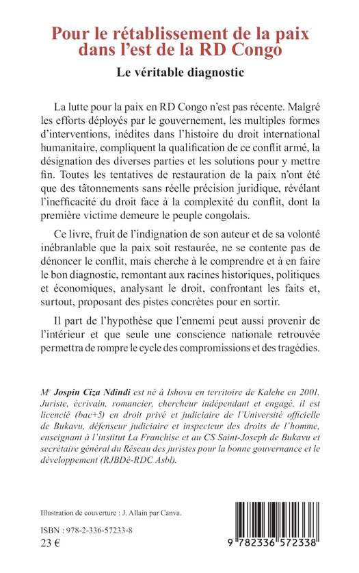 La lutte pour la paix en RD Congo n'est pas récente. Malgré les efforts déployés par le gouvernement, les multiples formes d'interventions, inédites dans l'histoire du droit international humanitaire, compliquent la qualification de ce conflit armé, la désignation des diverses parties et les solutions pour y mettre fin. Toutes les tentatives de restauration de la paix n'ont été que des tâtonnements sans réelle précision juridique, révélant l'inefficacité du droit face à la complexité du conflit, dont la première victime demeure le peuple congolais. Ce livre, fruit de l'indignation de son auteur et de sa volonté inébranlable que la paix soit restaurée, ne se contente pas de dénoncer le conflit, mais cherche à le comprendre et à en faire le bon diagnostic, remontant aux racines historiques, politiques et économiques, analysant le droit, confrontant les faits et, surtout, proposant des pistes concrètes pour en sortir. Il part de l'hypothèse que l'ennemi peut aussi provenir de l'intérieur et que seule une conscience nationale retrouvée permettra de rompre le cycle des compromissions et des tragédies.