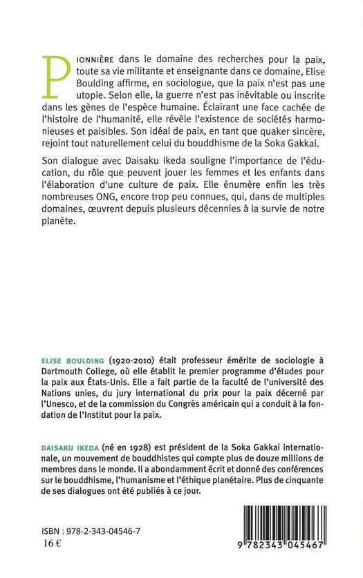 Pionnière dans le domaine des recherches pour la paix, toute sa vie militante et enseignante dans ce domaine, Elise Boulding affirme, en sociologue, que la paix n'est pas une utopie. Eclairant une face cachée de l'histoire de l'humanité, elle révèle l'existence de sociétés harmonieuses et paisibles. Son idéal de paix, en tant que quaker sincère, rejoint tout naturellement celui du bouddhisme de la Soka Gakkai. Son dialogue avec Daisaku Ikeda souligne l'importance de l'éducation, du rôle des femmes et des enfants dans l'élaboration d'une culture de la paix.