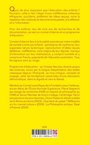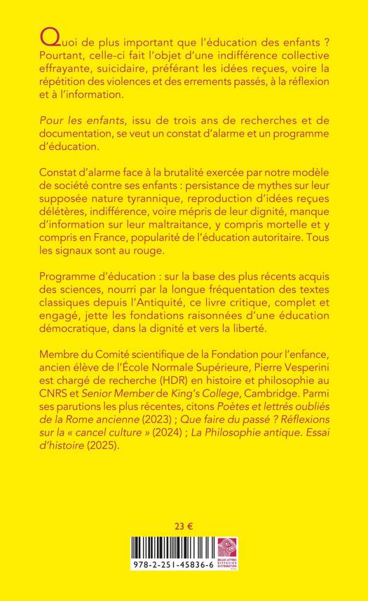 Quoi de plus important que l’éducation des enfants ? Pourtant, celle-ci fait l’objet d’une indifférence collective effrayante, suicidaire, préférant les idées reçues, voire la répétition des violences et des errements passés, à la réflexion et à l’information. Pour les enfants, issu de trois ans de recherches et de documentation, se veut un constat d’alarme et un programme d’éducation. Constat d’alarme face à la brutalité exercée par notre modèle de société contre ses enfants : persistance de mythes sur leur supposée nature tyrannique, reproduction d’idées reçues délétères, indifférence, voire mépris de leur dignité, manque d’information sur leur maltraitance, y compris mortelle et y compris en France, popularité de l’éducation autoritaire. Tous les signaux sont au rouge.