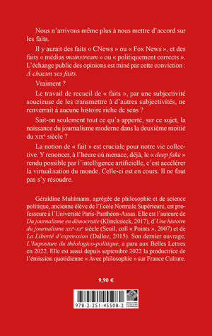 Nous n'arrivons meme plus a nous mettre d'accord sur les faits. Il y aurait des faits "CNews" ou "Fox News", et des faits "medias mainstream" ou "politiquement corrects". L'echange public des opinions est mine par cette conviction: A chacun ses faits. Vraiment ? Le travail de recueil de "faits", par une subjectivite soucieuse de les transmettre a d'autres subjectivites, ne renverrait a aucune histoire riche de sens ? Sait-on seulement tout ce qu'a apporte, sur ce sujet, la naissance du journalisme moderne dans la deuxieme moitie du XIXe siecle? La notion de "fait" est cruciale pour notre vie collective. Y renoncer, a l'heure ou menace, deja, le "deep fake" rendu possible par l'intelligence artificielle, c'est accelerer, la virtualisation du monde. Celle-ci est en cours. Il ne faut pas s'y resoudre.