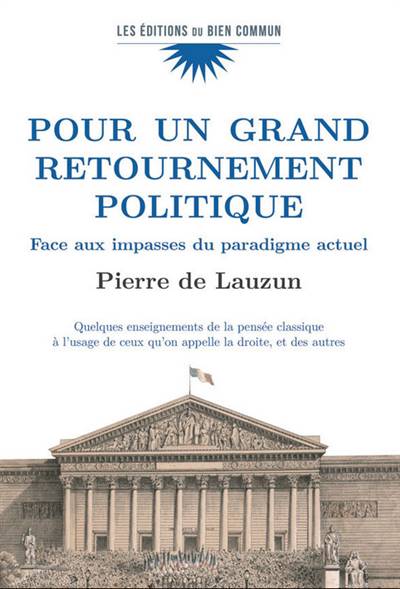 Face aux impasses du paradigme politique et idéologique actuel, l'auteur met toute son érudition au service d'une action publique renouvelée. Il analyse les limites de la pensée moderne qui nous ont amené à notre situation et convoque la pensée classique pour fournir aux politiques les principes et les outils d'un renouveau de notre pays. Ce faisant, il propose une grille de lecture des grands courants et un au'delà des clivages droite'gauche ou conservatisme'progressisme : une vision politique réellement dédiée à la quête du Bien Commun, qui passe par un grand retournement de la pensée et de l'action politique. AUTEUR Pierre de Lauzun (X et ENA) était directeur général de la Fédération bancaire française et délégué général de l'Association française des marchés financiers (AMAFI). Mais il a toujours eu une deuxième activité d'essayiste, primé au niveau international : Finance : un regard chrétien (Éditions Embrasure), prix international Centesimus annus (Vatican) ; Philosophie de la Foi (Éditions Arjalas) ; La finance peut'elle être au service de l'homme ' (Éditions DDB) ; L'avenir de la démocratie (Éditions FX de Guibert) ; L'économie et le christianisme (Éditions FX de Guibert) ; Christianisme et croissance économique (Éditions Parole et Silence) ; Guide de survie (Éditions TerraMare)...