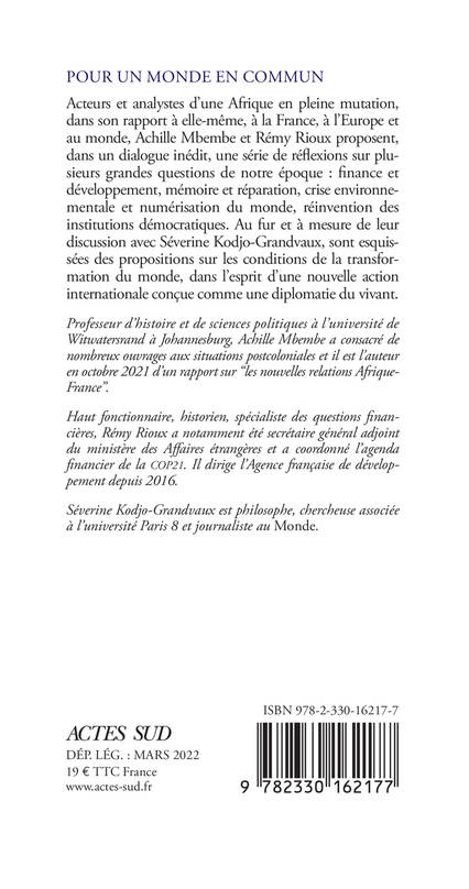 Acteurs et analystes d'une Afrique en pleine mutation, dans son rapport à elle-même, à la France, à l'Europe et au monde, Achille Mbembe et Rémy Rioux proposent, dans un dialogue inédit, une série de réflexions sur plusieurs grandes questions de notre époque : finance et développement, mémoire et réparation, crise environnementale et numérisation du monde, réinvention des institutions démocratiques. Au fur et à mesure de leur discussion avec Séverine Kodjo-Grandvaux, sont esquissées des propositions sur les conditions de la transformation du monde, dans l'esprit d'une nouvelle action internationale conçue comme une diplomatie du vivant.