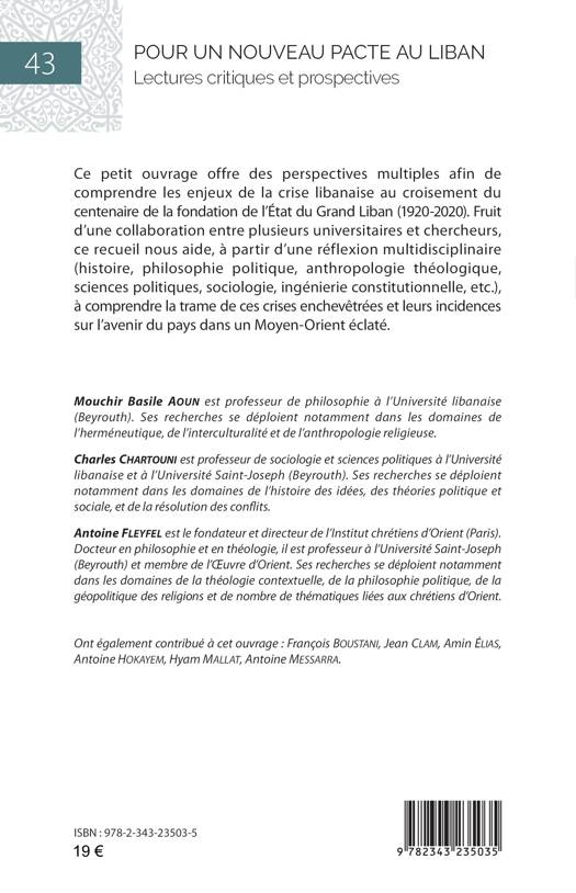 Ce petit ouvrage offre des perspectives multiples afin de comprendre les enjeux de la crise libanaise au croisement du centenaire de la fondation de l'État du Grand Liban (1920-2020). Fruit d'une collaboration entre plusieurs universitaires et chercheurs, ce recueil nous aide, à partir d'une réflexion multidisciplinaire (histoire, philosophie politique, anthropologie théologique, sciences politiques, sociologie, ingénierie constitutionnelle, etc.), à comprendre la trame de ces crises enchevêtrées et leurs incidences sur l'avenir du pays dans un Moyen-Orient éclaté.