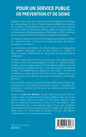 Quelques années après avoir décortiqué la faiblesse des politiques de « santé publique » en France, l’auteur élargit ses analyses à l’ensemble des facettes du « système de santé » français. ll analyse toutes les tentatives de réformes. L’étude porte ensuite sur la succession de diagnostics des défauts du «système de santé». Les conséquences sont évidentes : les « déserts médicaux » et l’engorgement des «urgences hospitalières». En 2018, la Haute Autorité de Santé estimait que, si des réformes avaient été faites, la « dépense courante de santé » pourrait chaque année être de 50 milliards inférieure. Sur cette lancée, totalement abandonnée depuis 2019, l’auteur décrit ce que serait enfin un « service public de prévention et de soins », si bénéfique à la population.