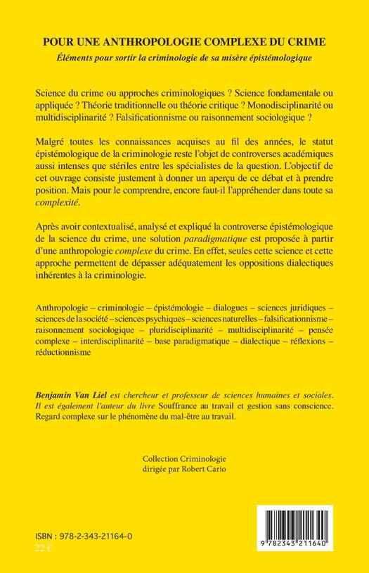 Le statut épistémologique de la criminologie est l'objet de controverses académiques stériles. Cet ouvrage vise à donner un aperçu de ce débat et à prendre position. Pour ce faire, les prolégomènes sur le crime (réalité substantielle, construction sociale, déviance, délinquance, etc.) seront présentés dans un premier temps, afin de saisir la complexité de l'objet d'étude. Ensuite, un portrait historique de cinq traditions criminologiques (italienne, française, belge, allemande, nord-américaine) sera dressé pour comprendre les enjeux de cette science. Après, la criminologie sera analysée d'un point de vue épistémologique pour exposer la situation complexe dans laquelle son objet d'étude la plonge. Enfin, une solution paradigmatique pour sortir la criminologie de sa misère épistémologique sera proposée à partir d'une anthropologie du crime complexe.