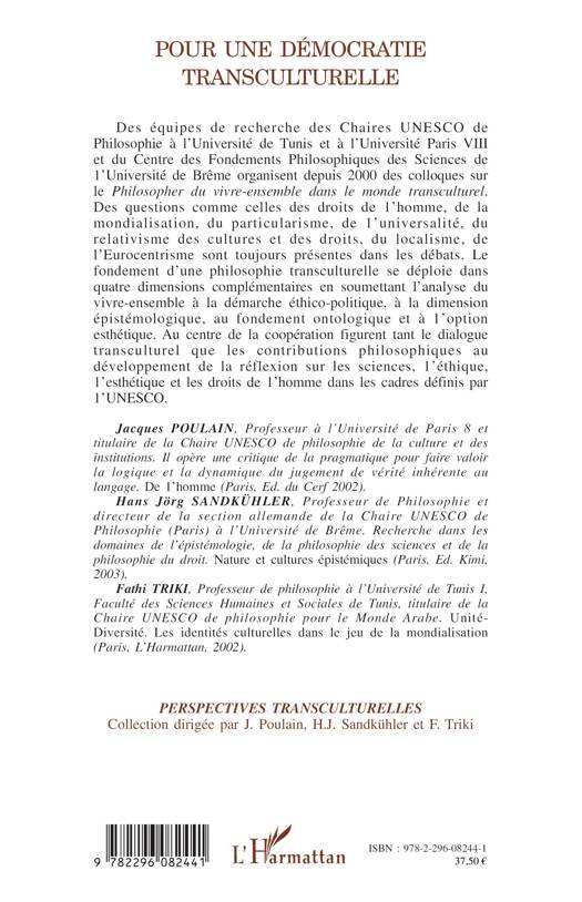 Le fondement d'une philosophie transculturelle se déploie dans quatre dimensions complémentaires en soumettant l'analyse du vivre-ensemble à la démarche éthico-politique, à la dimension épistémologique, au fondement ontologique et à l'option esthétique. Au centre de la coopération figurent tant le dialogue transculturel que les contributions philosophiques au développement de la réflexion sur les sciences, l'éthique, l'esthétique et les droits de l'homme dans les cadres définis par l'UNESCO.