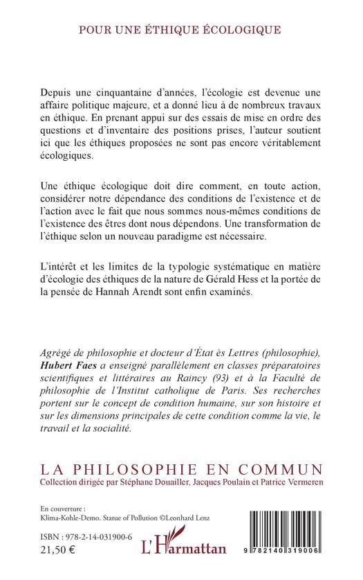 Depuis une cinquantaine d'années, l'écologie est devenue une affaire politique majeure, et a donné lieu à de nombreux travaux en éthique. En prenant appui sur des essais de mise en ordre des questions et d'inventaire des positions prises, l'auteur soutient ici que les éthiques proposées ne sont pas encore véritablement écologiques. Une éthique écologique doit dire comment, en toute action, considérer notre dépendance des conditions de l'existence et de l'action avec le fait que nous sommes nous-mêmes conditions de l'existence des êtres dont nous dépendons. Une transformation de l'éthique selon un nouveau paradigme est nécessaire. L'intérêt et les limites de la typologie systématique en matière d'écologie des éthiques de la nature de Gérald Hess et la portée de la pensée de Hannah Arendt sont enfin examinés.