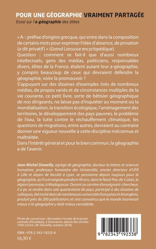 Comment se fait-il que d'aussi nombreux intellectuels, personnalités des médias, politiciens, élites de la France, étalent autant leur a-géographie, y compris beaucoup de ceux qui devraient promouvoir la géographie ? S'appuyant sur des dizaines d'exemples, ce petit livre, sorte de bêtisier géographique de nos dirigeants, ne laisse pas d'inquiéter au moment où la mondialisation, la transition écologique, l'aménagement des territoires, le développement des pays pauvres, le problème de l'eau, la lutte contre le réchauffement climatique, les questions de migrations devraient au contraire donner une vigueur nouvelle à cette discipline méconnue et parfois maltraitée.