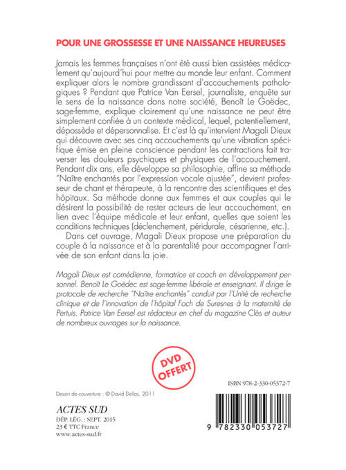 Jamais les femmes françaises n'ont été aussi bien assistées médicalement qu'aujourd'hui pour mettre au monde leur enfant. Comment expliquer alors le nombre grandissant d'accouchements pathologiques ? Pendant que Patrice Van Eersel, journaliste, enquête sur le sens de la naissance dans notre société, Benoît Le Goëdec, sage-femme, explique clairement qu'une naissance ne peut être simplement confiée à un contexte médical, lequel, potentiellement, dépossède et dépersonnalise. Et c'est là qu'intervient Magali Dieux qui découvre avec ses cinq accouchements qu'une vibration spécifique émise en pleine conscience pendant les contractions fait traverser les douleurs psychiques et physiques de l'accouchement. Pendant dix ans, elle développe sa philosophie, affine sa méthode "Naître enchantés par l'expression vocale ajustée", devient professeur de chant et thérapeute, à la rencontre des scientifiques et des hôpitaux. Sa méthode donne aux femmes et aux couples qui le désirent la possibilité de rester acteurs de leur accouchement, en lien avec l'équipe médicale et leur enfant, quelles que soient les conditions techniques (déclenchement, péridurale, césarienne, etc.).