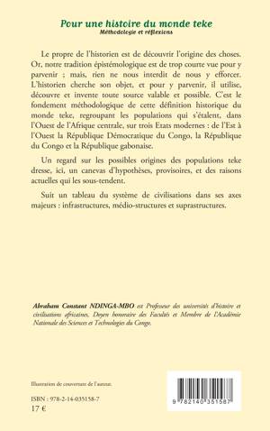 Le propre de l'historien est de découvrir l'origine des choses. Or, notre tradition épistémologique est de trop courte vue pour y parvenir ; mais, rien ne nous interdit de nous y efforcer. L'historien cherche son objet, et pour y parvenir, il utilise, découvre et invente toute source valable et possible. C'est le fondement méthodologique de cette définition historique du monde teke, regroupant les populations qui s'étalent, dans l'Ouest de l'Afrique centrale, sur trois Etats modernes : de l'Est à l'Ouest la République Démocratique du Congo, la République du Congo et la République gabonaise. Un regard sur les possibles origines des populations teke dresse, ici, un canevas d'hypothèses, provisoires, et des raisons actuelles qui les sous-tendent. Suit un tableau du système de civilisations dans ses axes majeurs : infrastructures, médio-structures et suprastructures.