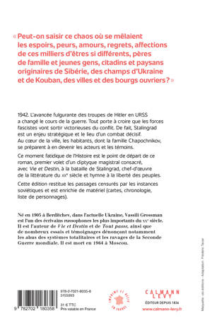 1942. L’avancée fulgurante des troupes de Hitler en URSS a changé le cours de la guerre. Tout porte à croire que les forces fascistes vont sortir victorieuses du conflit. De fait, Stalingrad est un enjeu stratégique et le lieu d’un combat décisif. Au coeur de la ville, les habitants, dont la famille Chapochnikov, se préparent à en devenir les acteurs et les témoins. Ce moment fatidique de l’Histoire est le point de départ de ce roman, premier volet d’un diptyque magistral consacré, avec Vie et Destin, à la bataille de Stalingrad, chef-d’oeuvre de la littérature du XXe siècle et hymne à la liberté des peuples. Cette édition restitue les passages censurés par les instances soviétiques et est enrichie de matériel (cartes, chronologie, liste de personnages).