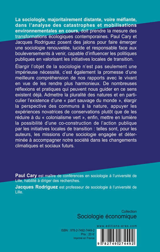 Parfois distante voire méfiante dans l’analyse des catastrophes et mobilisations environnementales actuelles, la sociologie n’a pas pris la mesure des transformations écologiques contemporaines. Si cette position s’explique par le contexte de naissance de la discipline – vouée, au xixe siècle, à accompagner et éclairer la dynamique du Progrès, ce qui supposait de rejeter toute explication en termes d’ordre naturel –, elle n’est plus tenable à l’ère de l’Anthropocène, où les humains apparaissent comme la principale force motrice de la biosphère. L’ouvrage propose de dépasser ce constat et d’œuvrer à l’émergence d’un projet sociologique renouvelé, élargi au vivant.