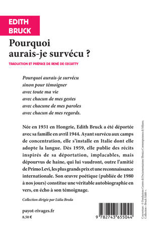 Née en 1931 en Hongrie, Edith Bruck a été déportée avec sa famille en avril 1944. Ayant survécu aux camps de concentration, elle s'installe en Italie dont elle adopte la langue. Dès 1959, elle publie des récits inspirés de sa déportation, implacables, mais dépourvus de haine, qui lui vaudront, outre l'amitié de Primo Levi, les plus grands prix et une reconnaissance internationale. Son oeuvre poétique (publiée de 1980 à nos jours) constitue une véritable autobiographie en vers, en écho à son témoignage.