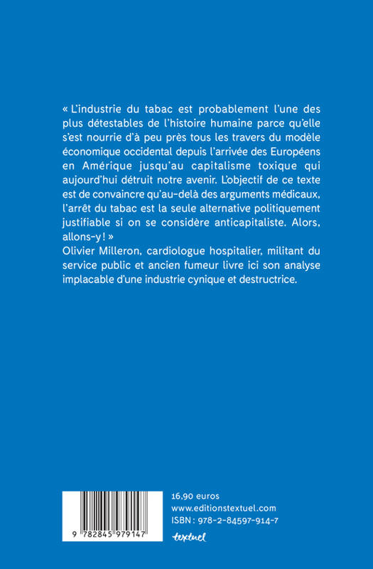 Par la radiographie d'une industrie cynique et destructrice, Olivier Milleron dévoile l'intrication de l'histoire du tabac avec celle du capitalisme et du colonialisme. Car l'industrie du tabac participe au pire du capitalisme mondialisé, échappant au contrôle des états et des citoyens. Pour l'auteur, se réclamer de la gauche anti-capitaliste et fumer relève de la contradiction politique. Cet ouvrage pamphlétaire ouvre le débat.