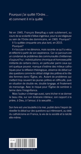 Né en 1945, François BŒSPFLUG a opté subitement, au cours de sa scolarité à l'École Nationale des Mines de Saint-Étienne, pour la vie religieuse au sein de l'Ordre des dominicains, en 1965. Pourquoi ? Il l'a quittée cinquante ans plus tard, en 2015. Pourquoi ? Il s'en explique ici. Il se pourrait que ce parcours soit un condensé de problèmes des communautés chrétiennes d'aujourd'hui : individualisme chronique et homosexualité militante de certains clercs, absence de débat sur des questions comme le célibat obligé des prêtres et le rôle des femmes dans l'Église, etc. Autant de problèmes qui mettent trop souvent les jeunes qui s'engagent dans les Ordres en difficulté, puis en situation de double vie, double langage, et finalement de mensonge. Son livre n'est pas un brûlot, mais plutôt une bouteille à la mer, publié dans l'espoir d'alimenter ou de réveiller le débat sur des questions qui intéressent, au-delà du catholicisme en France, la vie de la société et la laïcité elle-même.